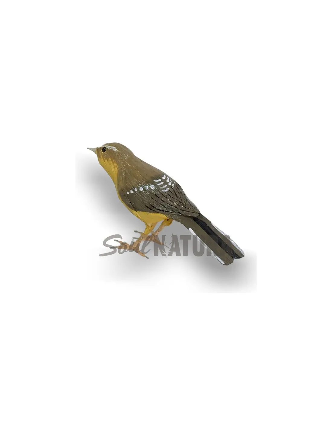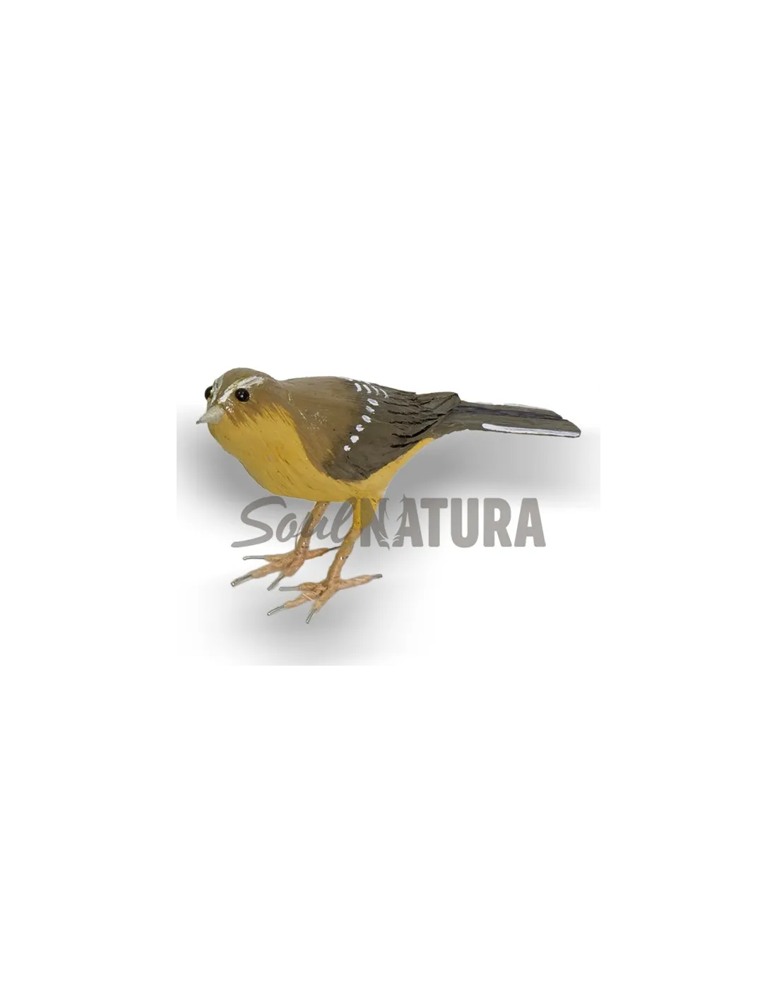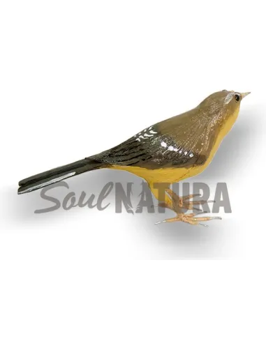 Réplica de un mosquitero canario (Phylloscopus canariensis) a tamaño natural con un acabado realista. Está fabricado a mano con pita (agave).