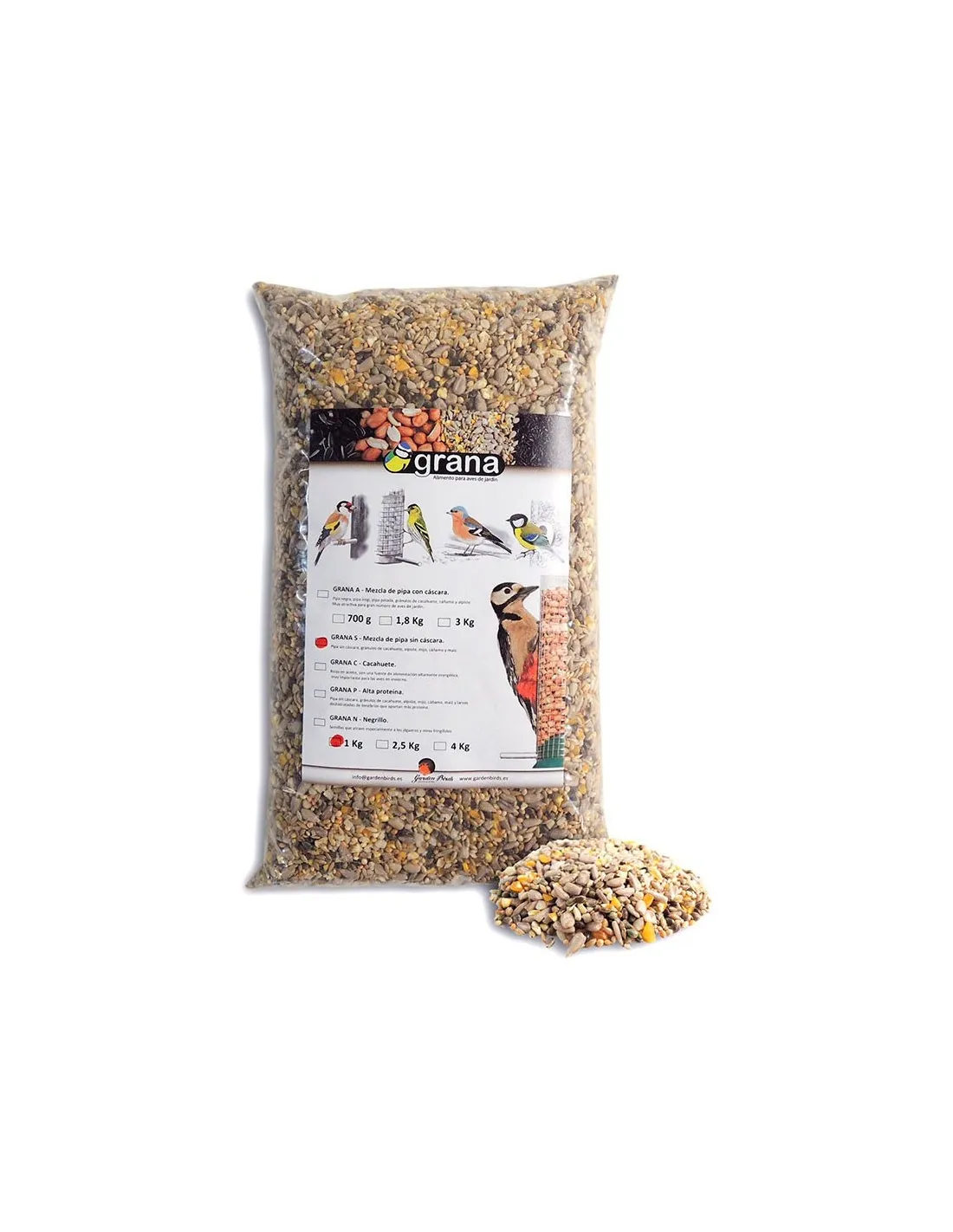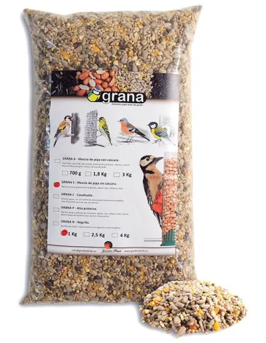Esta comida para aves está compuesta por pipas sin cáscara, trozos de cacahuete, mijo, maíz partido, cañamon, alpiste y larvas. Gracias a la variedad de los ingredientes atrae a muchas aves diferentes.