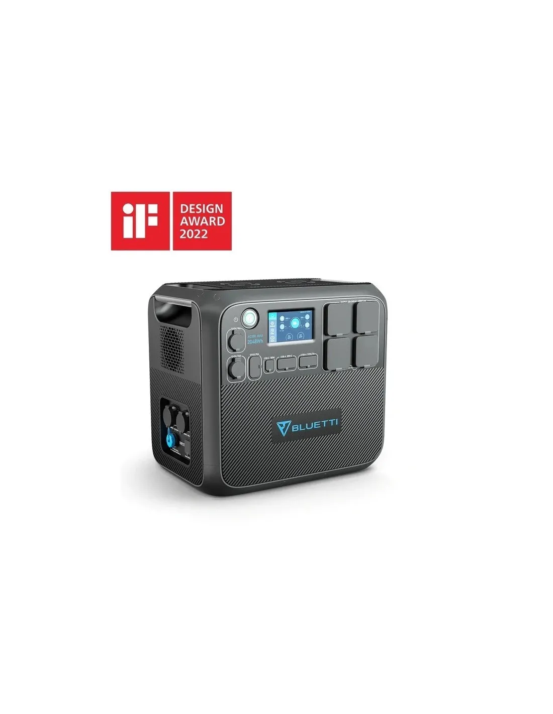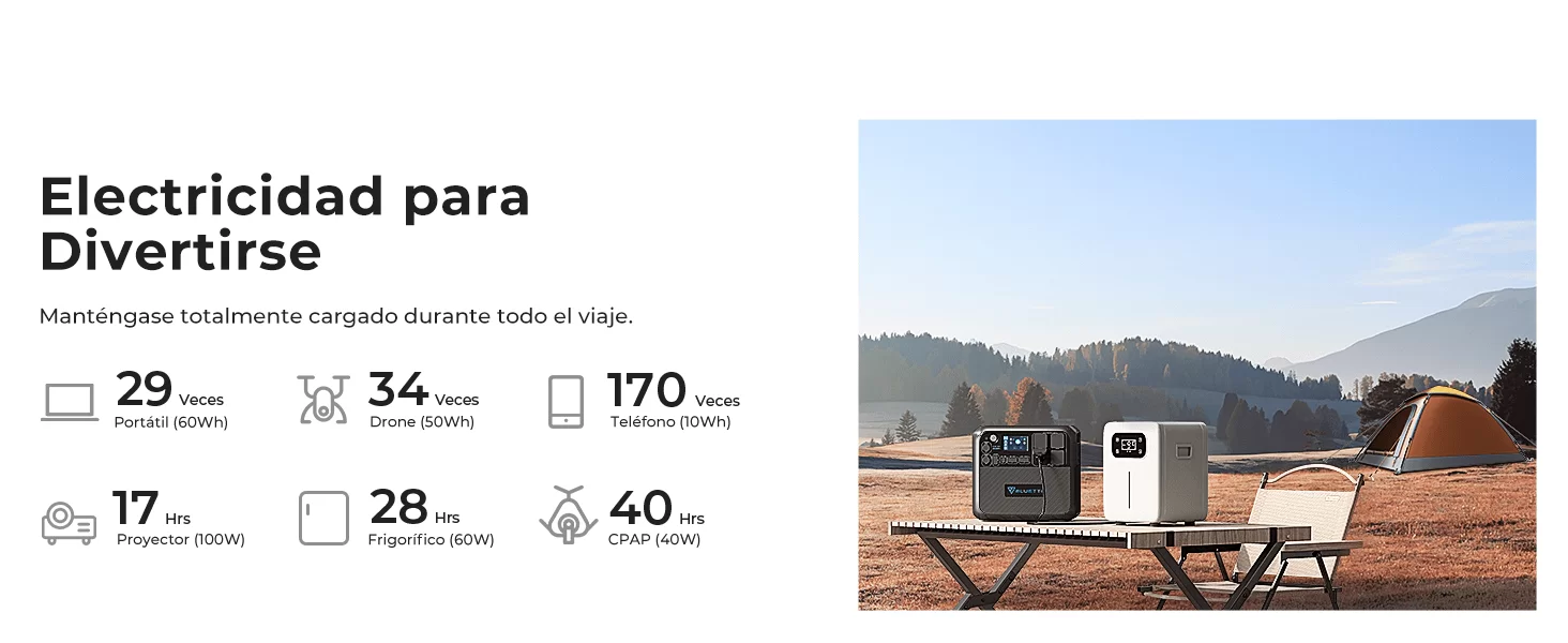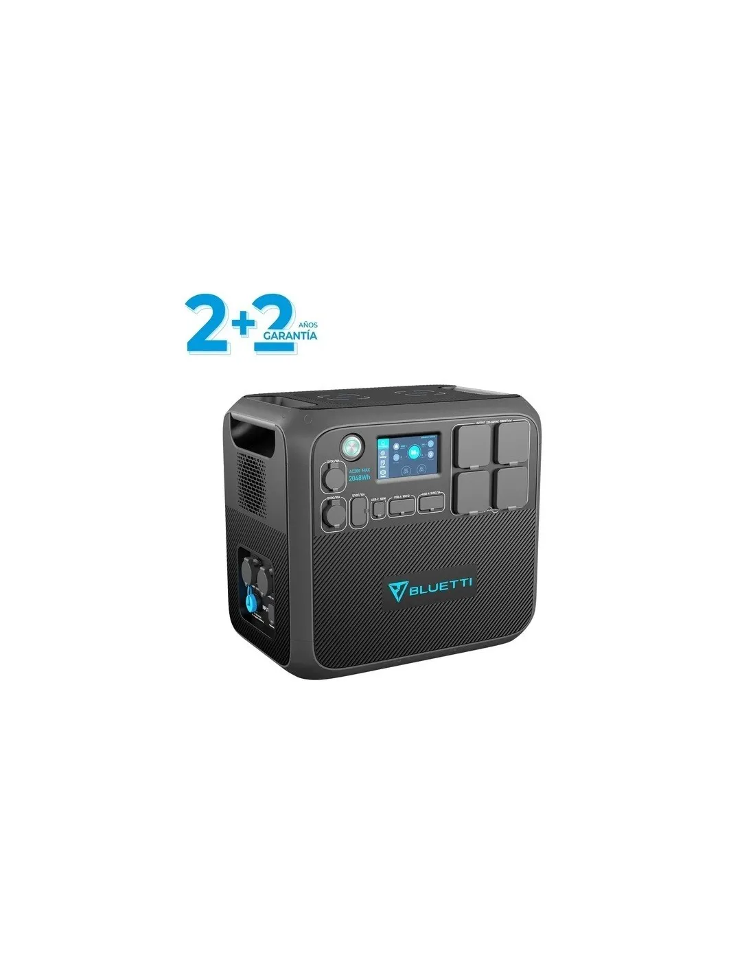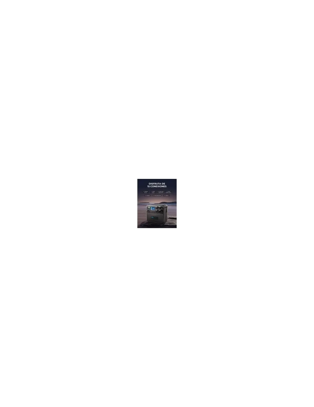 La capacidad de la batería es de 2048 Wh, ampliable con hasta 2 módulos adicionales. El inversor de corriente alterna (AC) proporciona 2.200 W de onda sinusoidal pura, con un pico de hasta 4800 W. Además, cuenta con una entrada solar de hasta 900 W y una entrada de adaptador de 400 W, con un total combinado de 1300 W. Todo se controla a través de una aplicación inteligente.