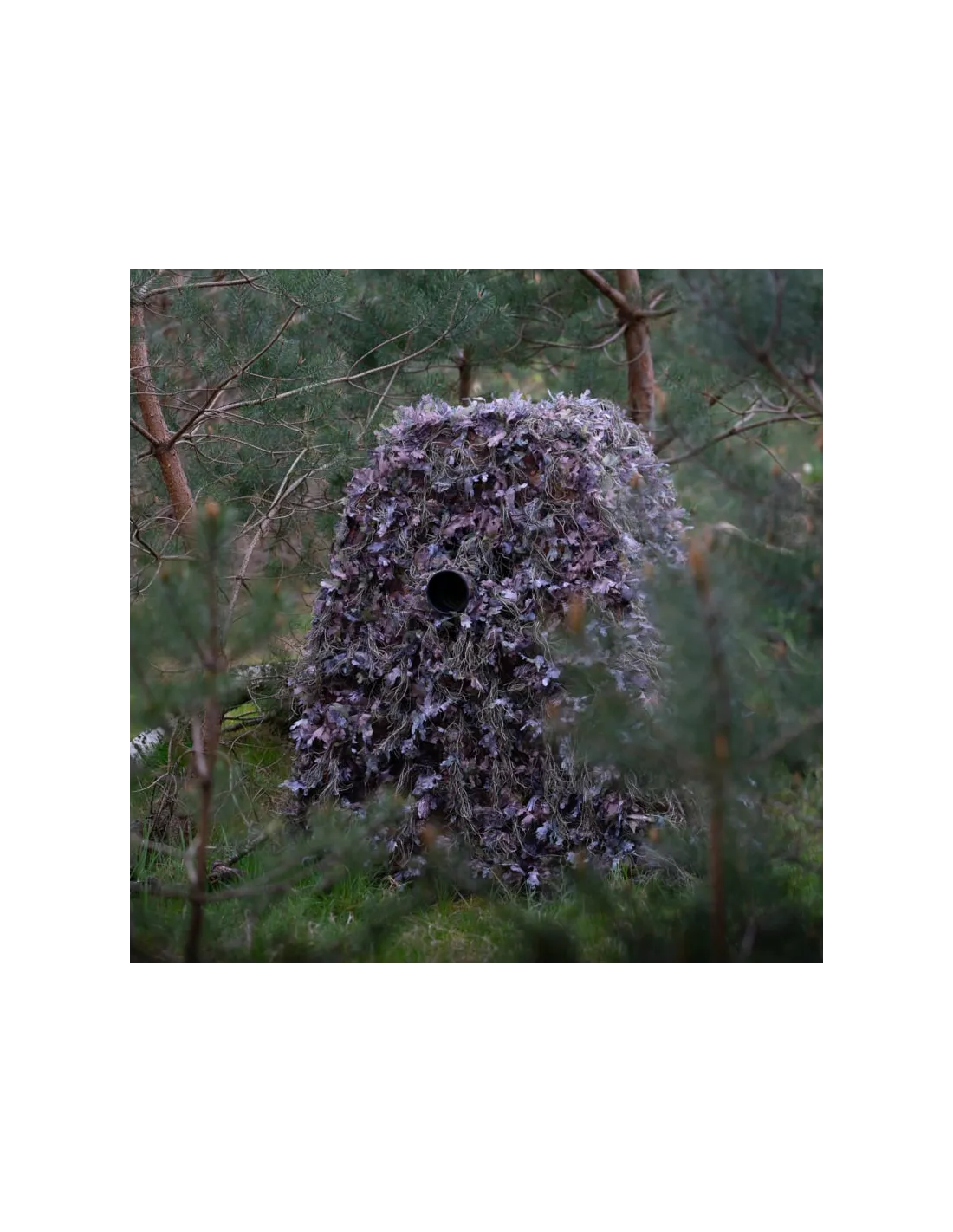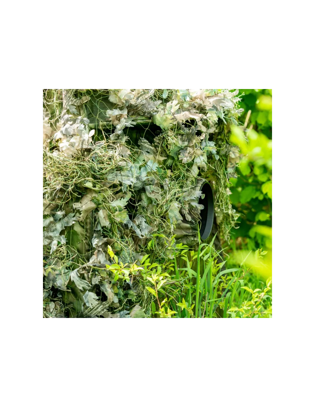 - Composición: estructura de red ligera, con hojas 3D y cuerdas ghillie en tonos verdes naturales.