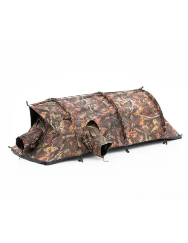 Su estructura reforzada de varillas de fibra ofrece una excelente estabilidad incluso con viento, mientras que la tela exterior de camuflaje marrón se integra perfectamente en entornos boscosos, zonas de matorral o praderas secas. Los grandes ventanales con mallas desmontables permiten una visión de 360º y el uso fluido del teleobjetivo desde cualquier ángulo, garantizando fotografías limpias y naturales.